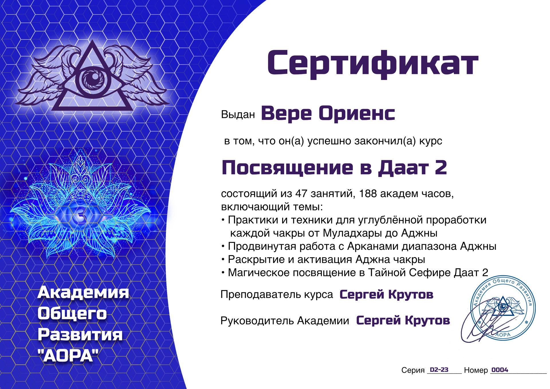 Vera Oriēns: «Моя миссия - это развитие и популяризация учения сефиротической философии и передача знаний о возможностях человеческого сознания. Я хочу, чтобы в нашем обществе увеличивалось количество людей, которые развивают себя, повышают свой культурный уровень, превращают свои жизни в шедевры и делают мир вокруг лучше. Ведь, как известно, мир вокруг отражает то, что есть внутри. Развивайте сознание - творите свою реальность!».